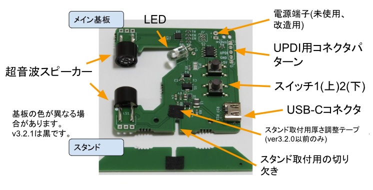 あるいは、他の方法でメイン基板を立てて固定しても構いません。 その場合、基板に導電性のものを接触させないことと、超音波スピーカーの近くに物が干渉しないように注意してください。